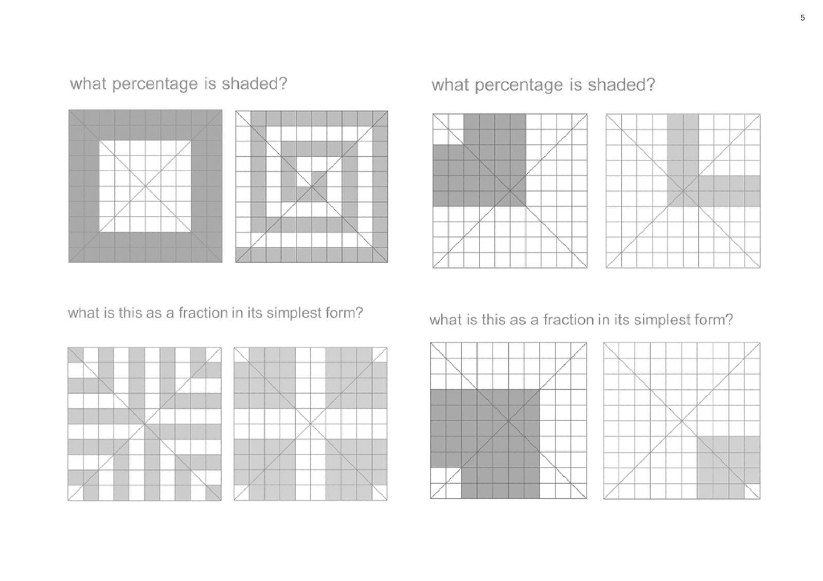 頁5上行左2, 下行左1的圖: 看對稱性 ; 其他: 計算正方形面積, 或可合併作一長方形